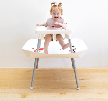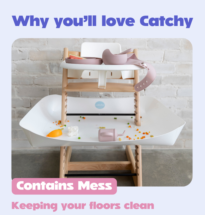 Catchy está hecho de un material impermeable y duradero, lo que lo hace muy fácil de limpiar. No es necesario quitarlo entre comidas; simplemente límpielo en su lugar (igual que limpia la bandeja de la trona) y estará listo para la siguiente comida. Puedes ver la demostración y los consejos de limpieza de Rachel, cofundadora de Catchy, aquí.